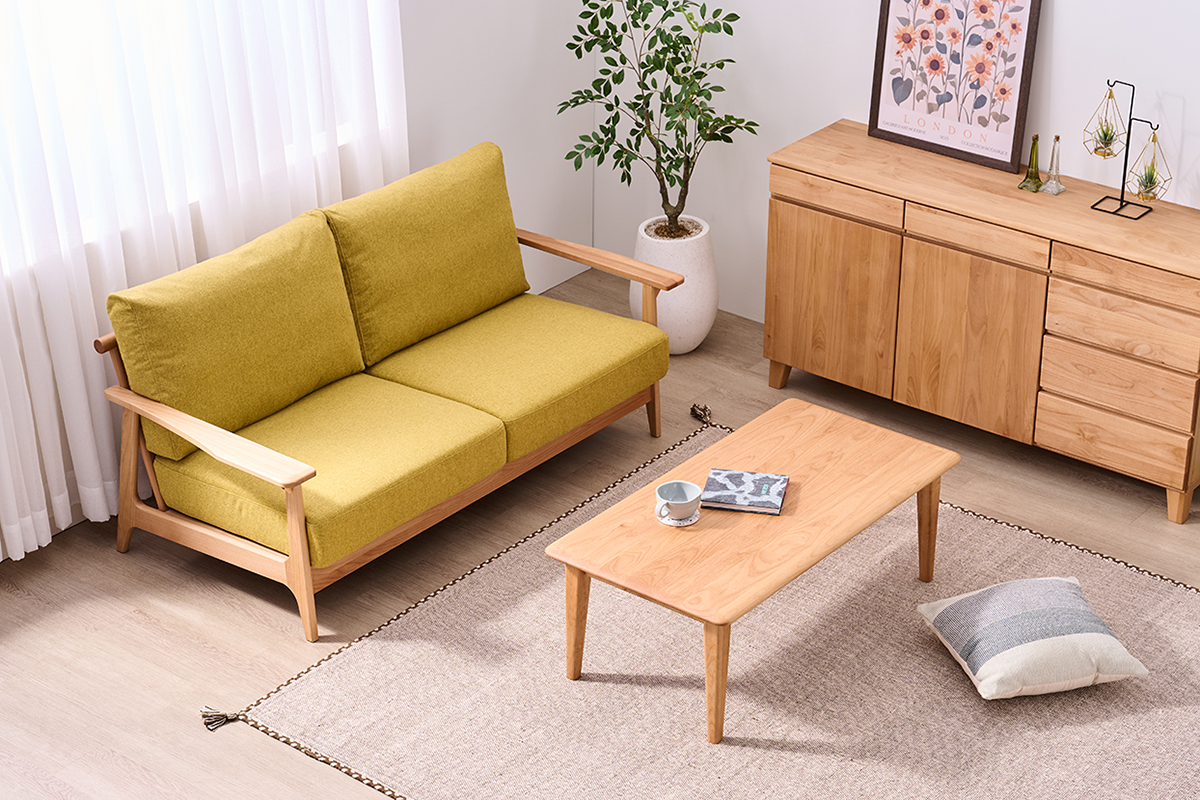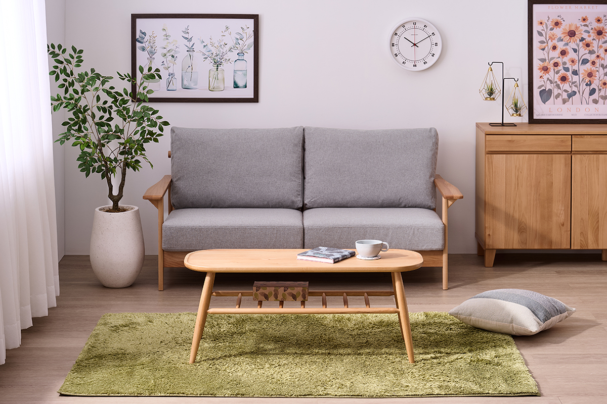 •木製のローテーブルを中心に、ナチュラルカラーのラグを合わせると、春らしい穏やかなリビングが完成します。