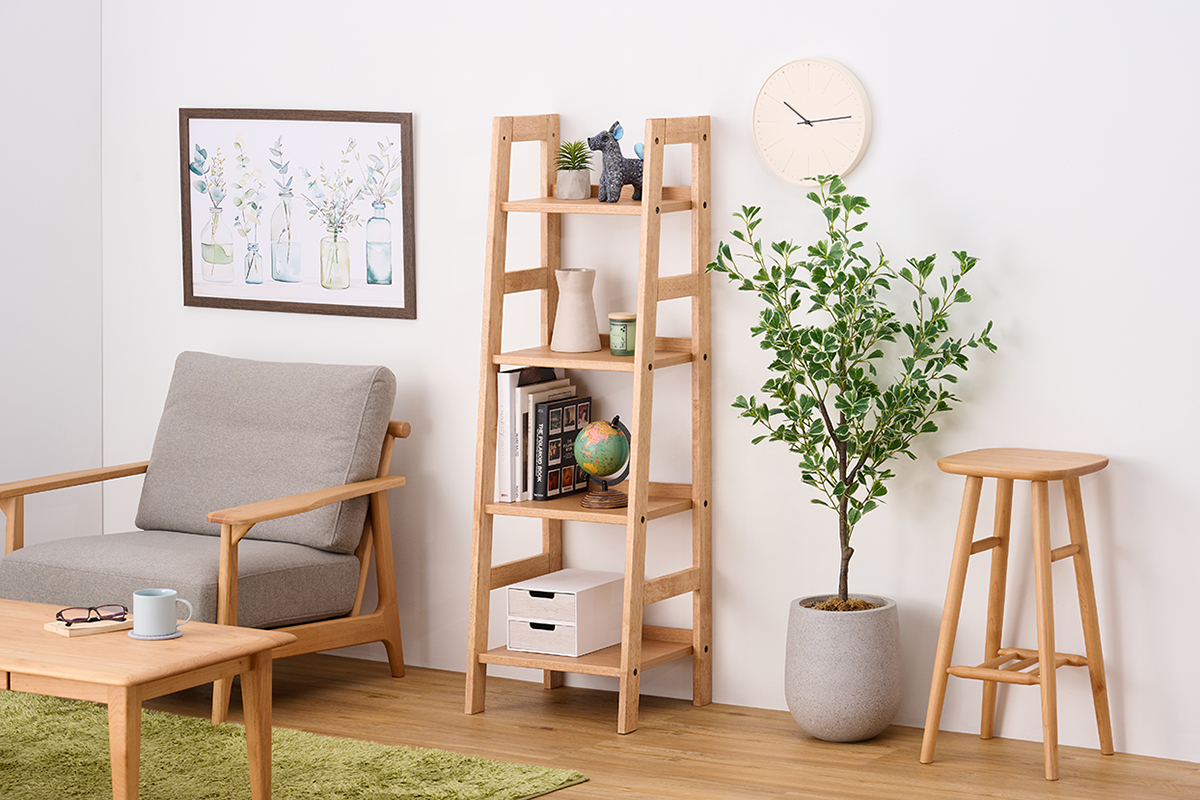 •背板のないシェルフやオープンラックを使えば、収納しながらも光を遮らず、軽やかな印象に仕上がります。